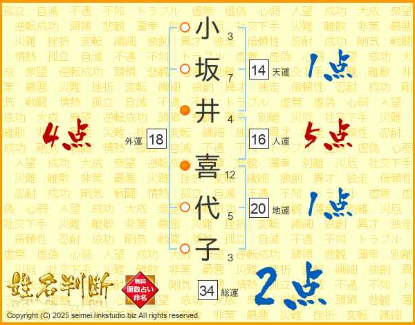 小(3画)坂(7画)井(4画) 喜(12画)代(5画)子(3画)