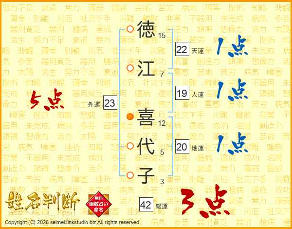 徳(15画)江(7画) 喜(12画)代(5画)子(3画)