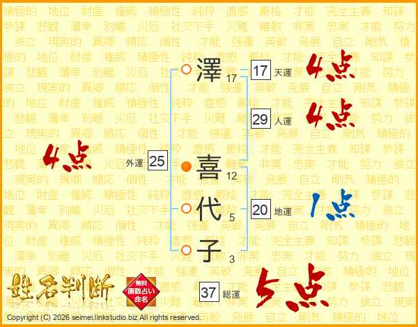 澤(17画) 喜(12画)代(5画)子(3画)