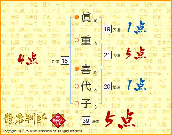 眞(10画)重(9画) 喜(12画)代(5画)子(3画)