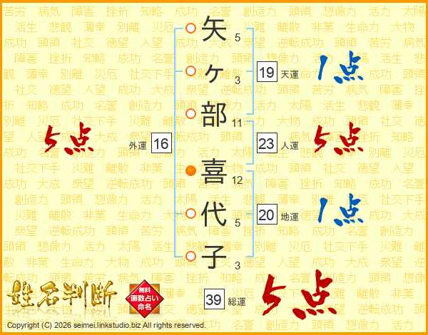矢ヶ部喜代子さんの総運は39画の5点!