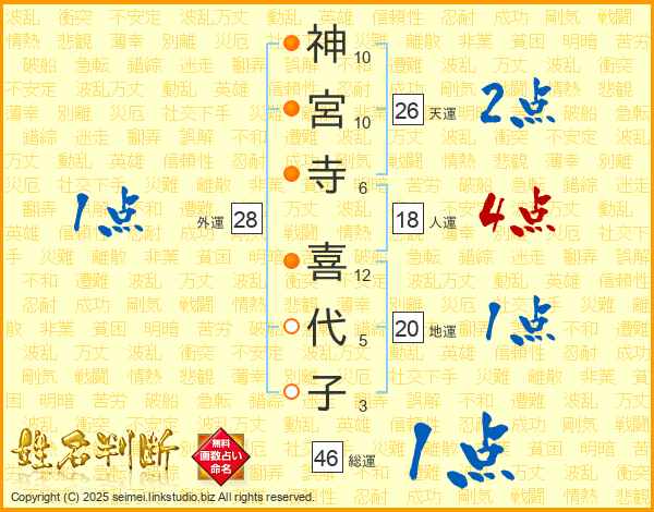 神(10画)宮(10画)寺(6画) 喜(12画)代(5画)子(3画)
