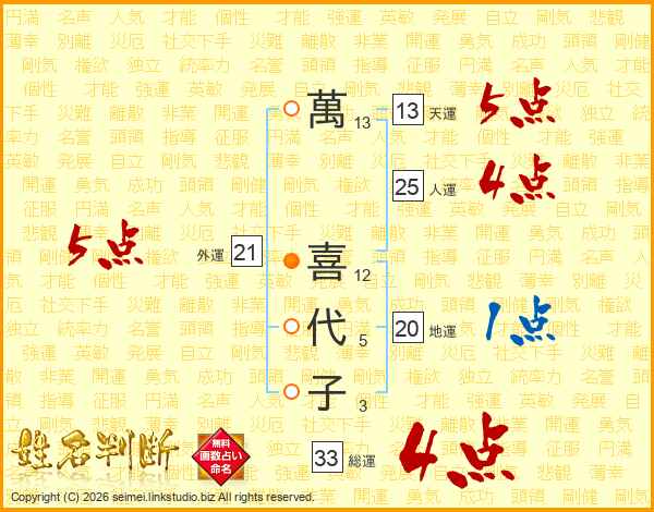生活面を象徴する運勢です。外部から受ける影響力を表し、結婚運、家庭運や職場、環境への順応性を表します。総運から人運を引いた画数。姓や名が1文字の場合を除く。