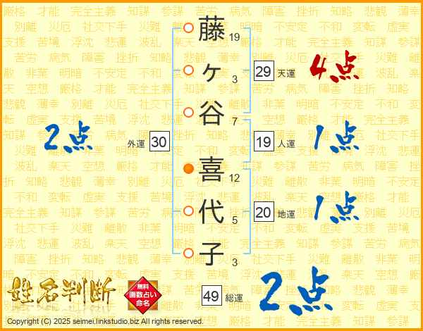 藤ヶ谷喜代子さんの総運は49画の2点!