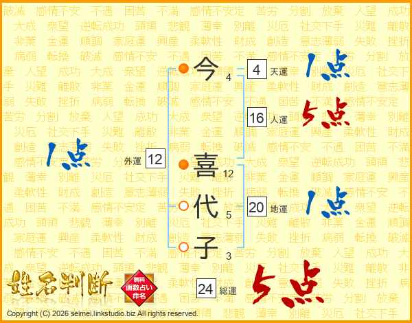 画数の奇数(○陽)と偶数(●陰)の配列で吉凶を占います。どちらかにかたよる名前は大凶名で避ける必要があります。画数の奇数偶数。