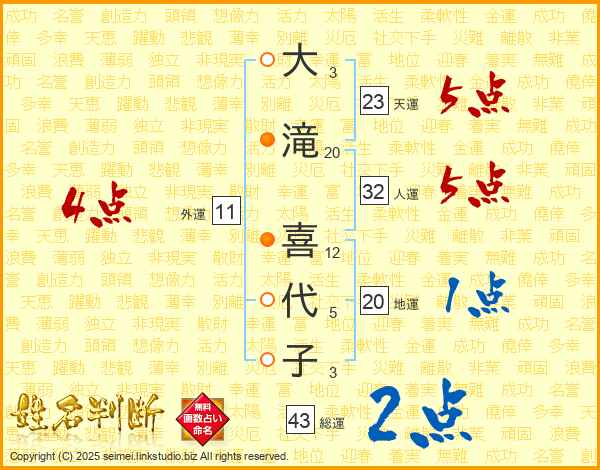 大(3画)滝(20画) 喜(12画)代(5画)子(3画)