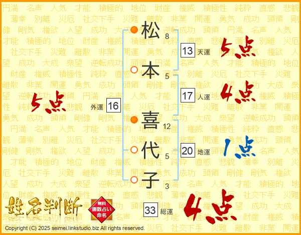 松(8画)本(5画) 喜(12画)代(5画)子(3画)