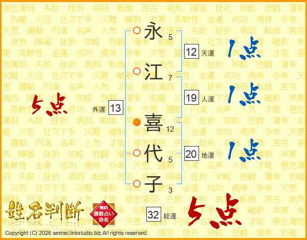 永(5画)江(7画) 喜(12画)代(5画)子(3画)