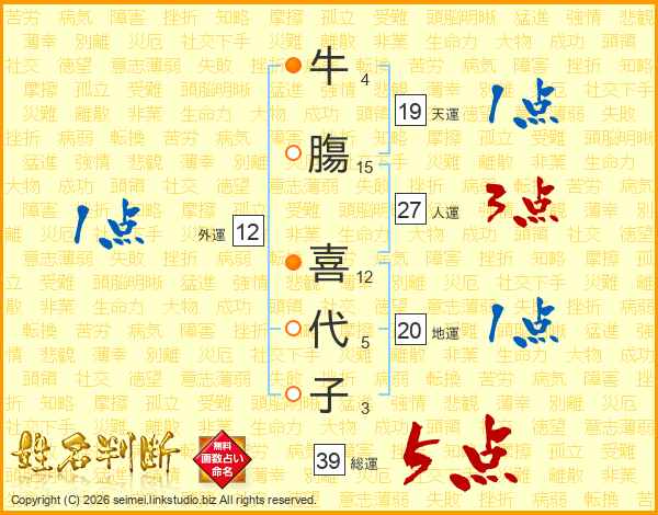牛(4画)膓(15画) 喜(12画)代(5画)子(3画)