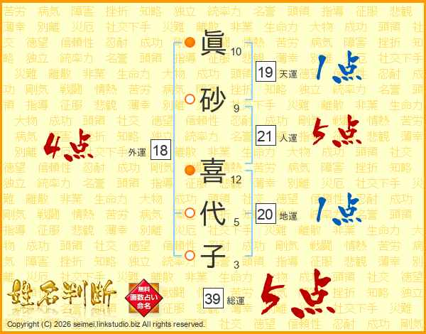 眞砂喜代子さんの総運は39画の5点!