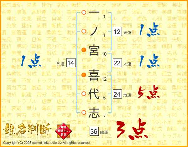 一(1画)ノ(1画)宮(10画) 喜(12画)代(5画)志(7画)