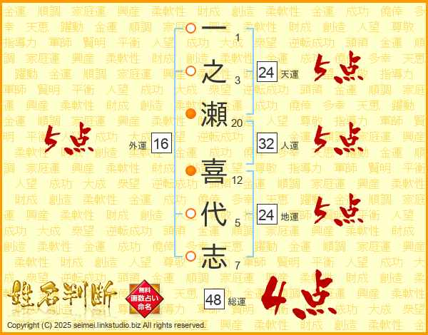 一(1画)之(3画)瀬(20画) 喜(12画)代(5画)志(7画)