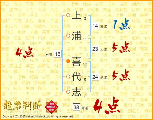 上(3画)浦(11画) 喜(12画)代(5画)志(7画)