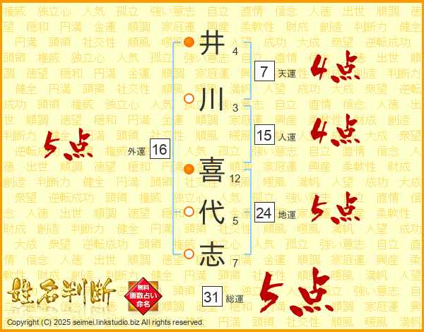 井(4画)川(3画) 喜(12画)代(5画)志(7画)
