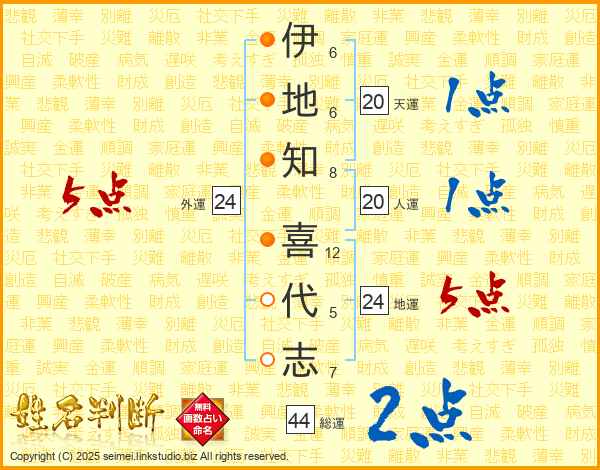 伊(6画)地(6画)知(8画) 喜(12画)代(5画)志(7画)