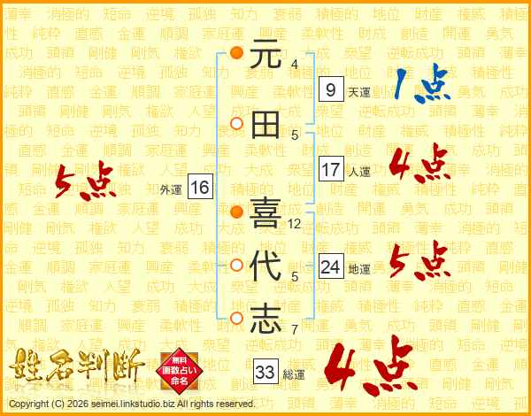 元(4画)田(5画) 喜(12画)代(5画)志(7画)