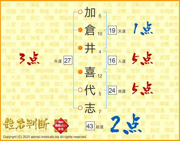 加(5画)倉(10画)井(4画) 喜(12画)代(5画)志(7画)