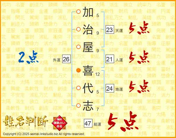 加(5画)治(9画)屋(9画) 喜(12画)代(5画)志(7画)