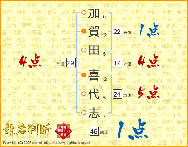 加(5画)賀(12画)田(5画) 喜(12画)代(5画)志(7画)