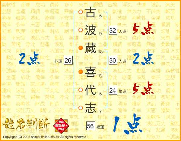 古(5画)波(9画)蔵(18画) 喜(12画)代(5画)志(7画)