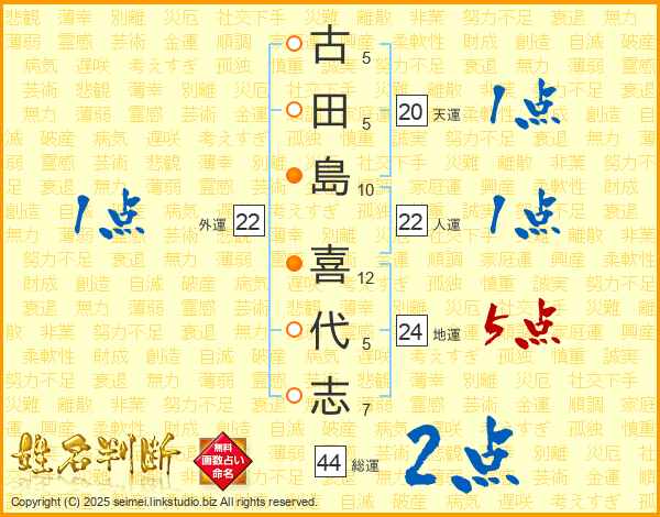 古(5画)田(5画)島(10画) 喜(12画)代(5画)志(7画)