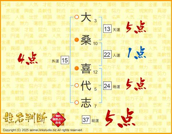 大(3画)桑(10画) 喜(12画)代(5画)志(7画)
