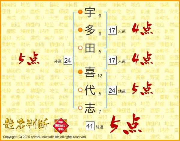 宇(6画)多(6画)田(5画) 喜(12画)代(5画)志(7画)