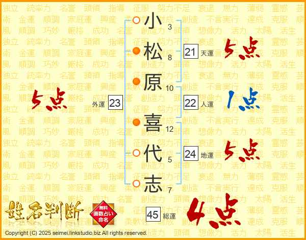 小(3画)松(8画)原(10画) 喜(12画)代(5画)志(7画)
