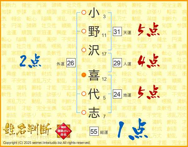 小(3画)野(11画)沢(17画) 喜(12画)代(5画)志(7画)