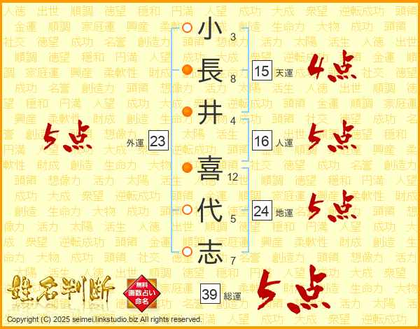 小(3画)長(8画)井(4画) 喜(12画)代(5画)志(7画)
