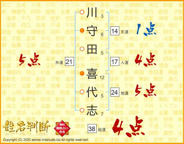 川(3画)守(6画)田(5画) 喜(12画)代(5画)志(7画)