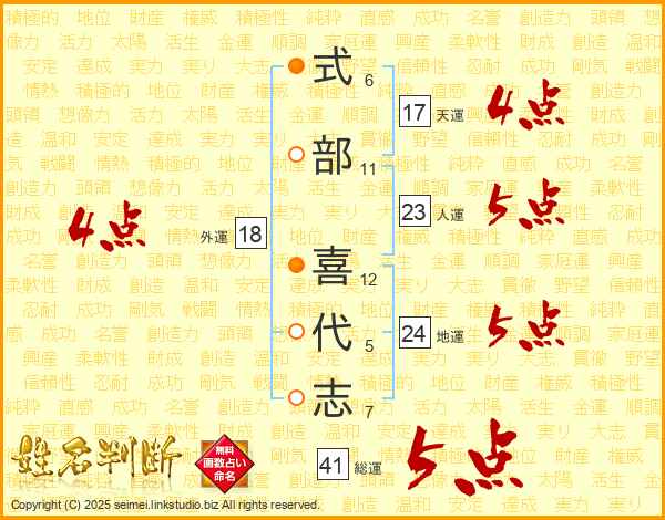 式(6画)部(11画) 喜(12画)代(5画)志(7画)