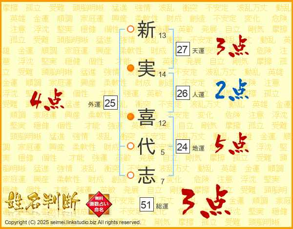 新(13画)実(14画) 喜(12画)代(5画)志(7画)