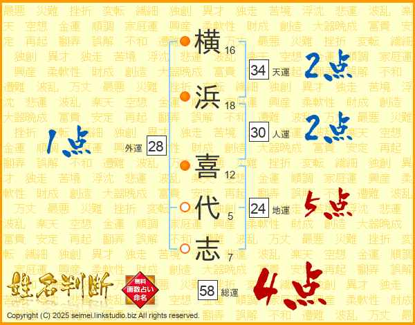 横(16画)浜(18画) 喜(12画)代(5画)志(7画)