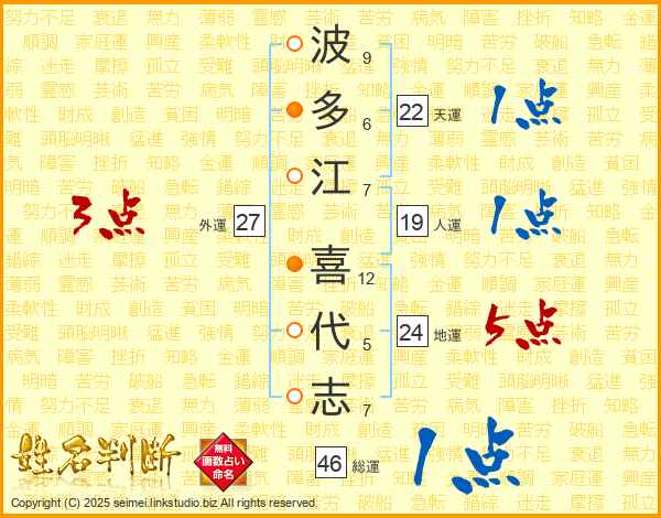 波(9画)多(6画)江(7画) 喜(12画)代(5画)志(7画)