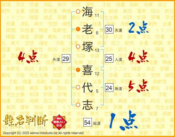 海(11画)老(6画)塚(13画) 喜(12画)代(5画)志(7画)