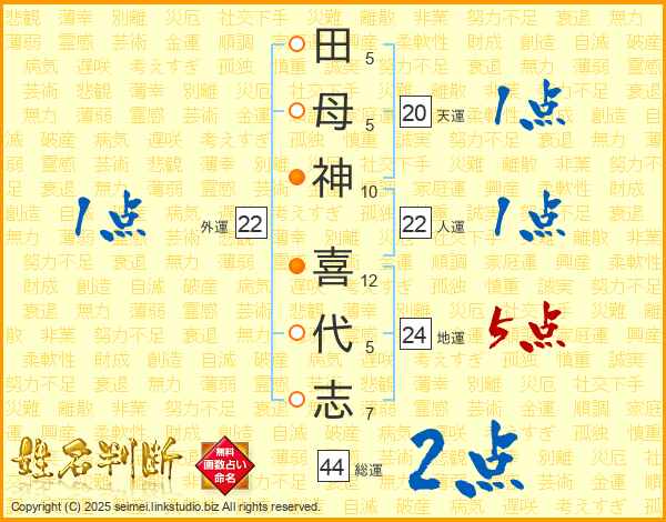 田(5画)母(5画)神(10画) 喜(12画)代(5画)志(7画)