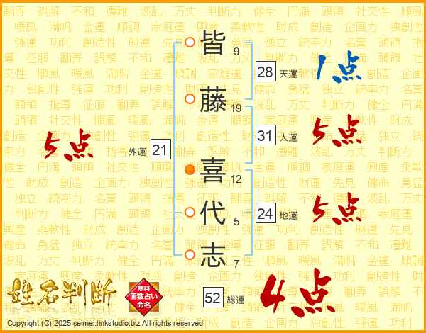 皆(9画)藤(19画) 喜(12画)代(5画)志(7画)