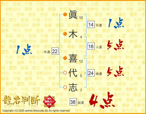 眞(10画)木(4画) 喜(12画)代(5画)志(7画)