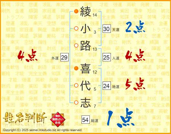 綾(14画)小(3画)路(13画) 喜(12画)代(5画)志(7画)