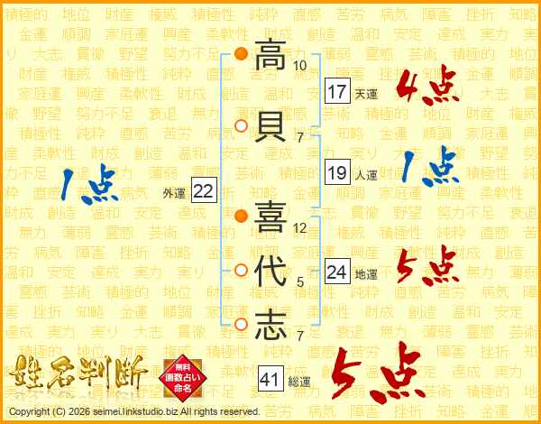 高(10画)貝(7画) 喜(12画)代(5画)志(7画)