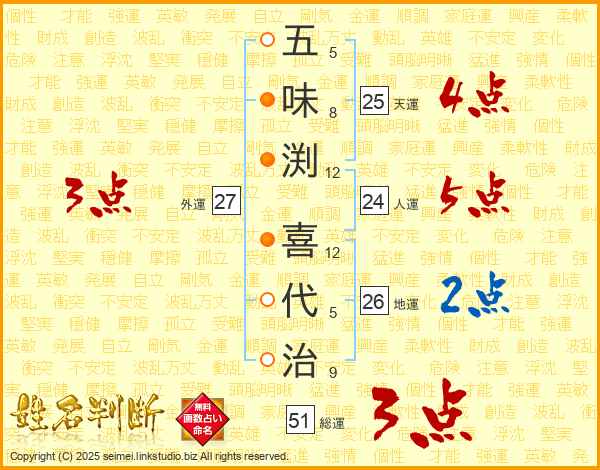 五(5画)味(8画)渕(12画) 喜(12画)代(5画)治(9画)