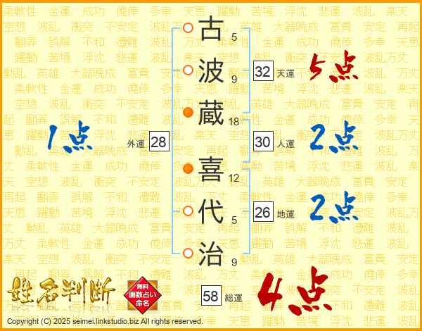 古(5画)波(9画)蔵(18画) 喜(12画)代(5画)治(9画)