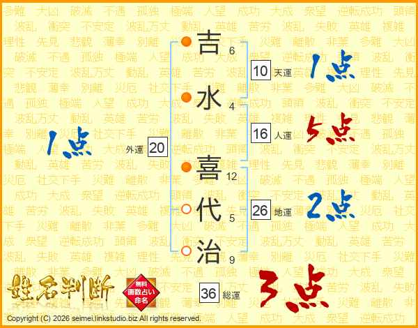 吉(6画)水(4画) 喜(12画)代(5画)治(9画)