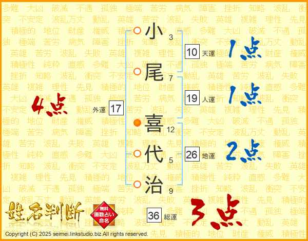 小(3画)尾(7画) 喜(12画)代(5画)治(9画)