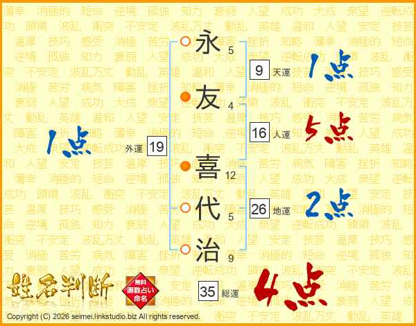 永(5画)友(4画) 喜(12画)代(5画)治(9画)