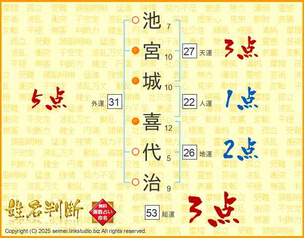 池(7画)宮(10画)城(10画) 喜(12画)代(5画)治(9画)