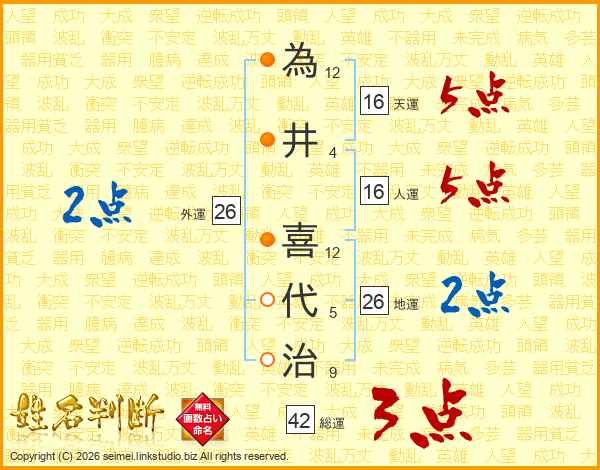 為(12画)井(4画) 喜(12画)代(5画)治(9画)