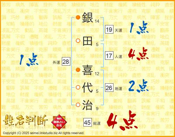 銀(14画)田(5画) 喜(12画)代(5画)治(9画)
