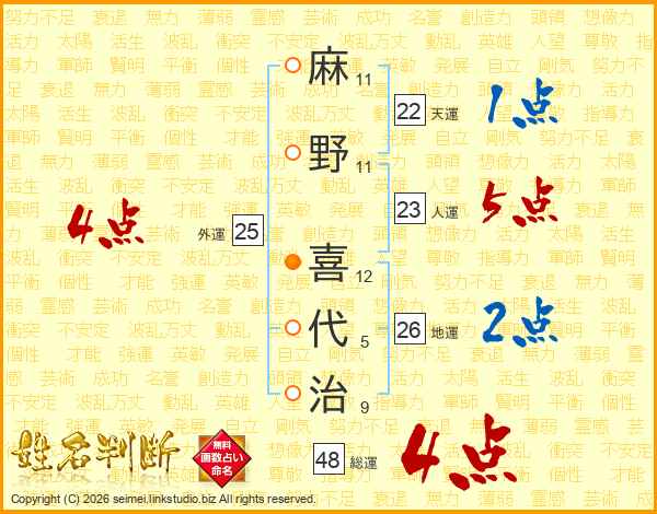 麻(11画)野(11画) 喜(12画)代(5画)治(9画)